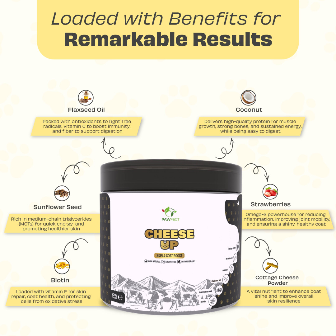 Verwen je hond op een gezonde manier met de romige smaak van Himalaya kaas, aardbeien en kokos. Cheese Up is een topper én traktatie in één. Deze poeder is rijk aan antioxidanten, vitaminen en mineralen die de huid en vacht laten stralen.