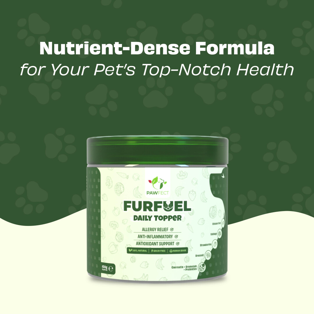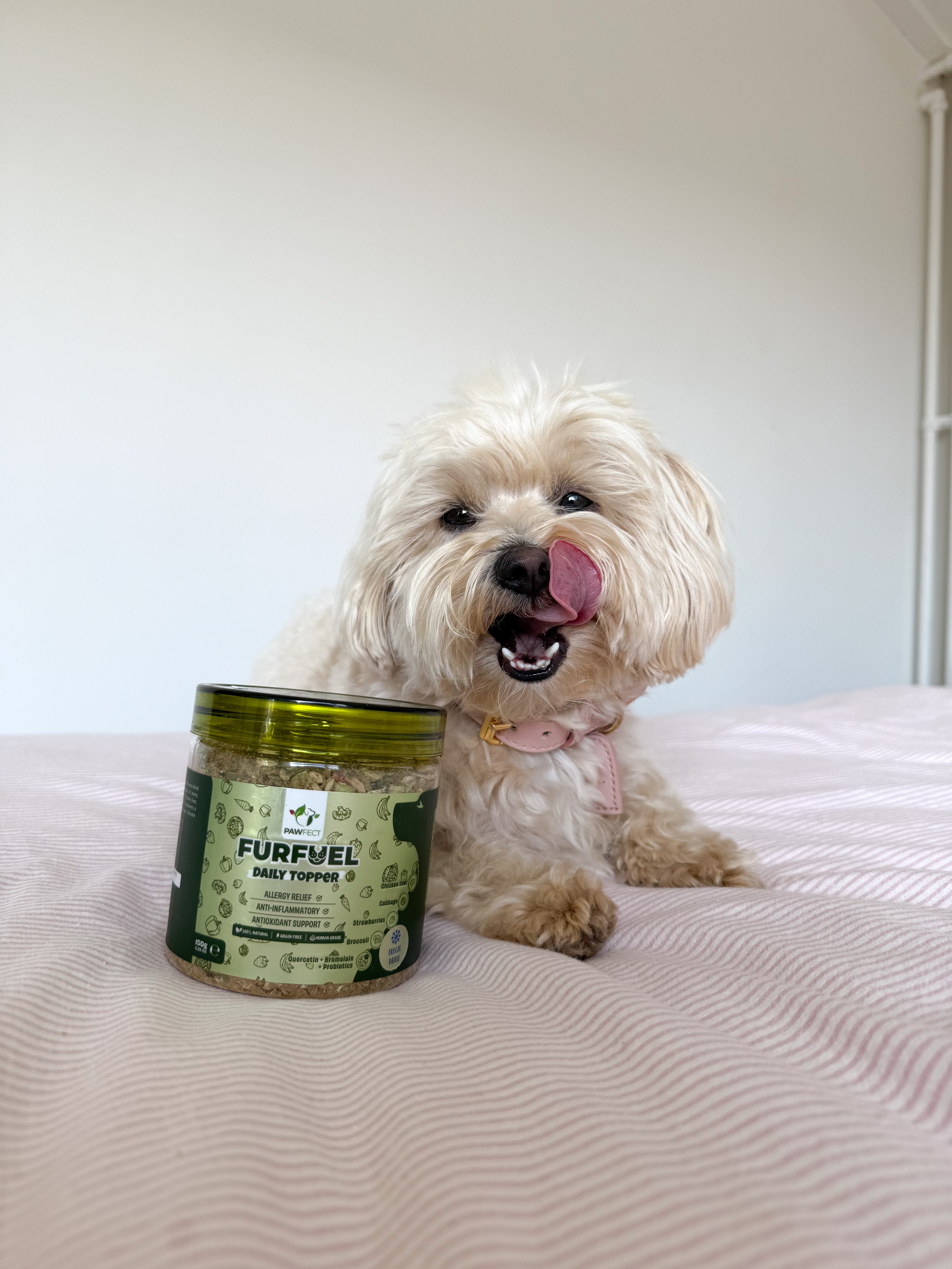 Is je hond minder enthousiast over zijn eten of wat sloom? Dan is FurFuel de perfecte toevoeging! Met een mix van kippenlever, spinazie en probiotica zorgt deze topper voor een heerlijke smaak én ondersteuning van vacht, immuunsysteem, spieren en botten.