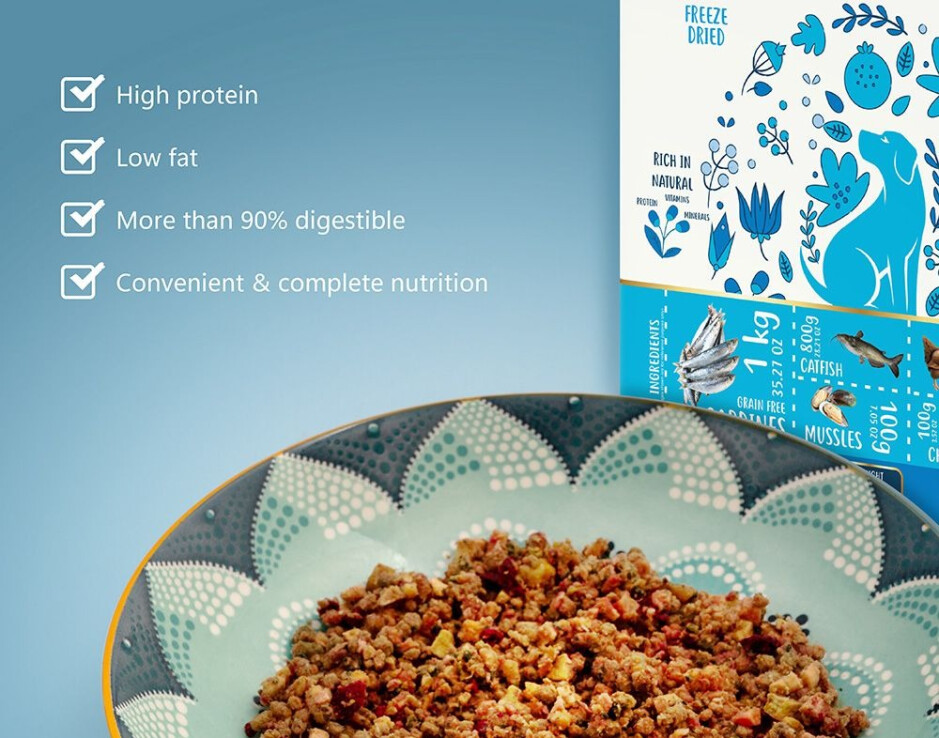 - 1 pak a 250gr Nature's Kitchen freeze dried Grain-free Fish recipe