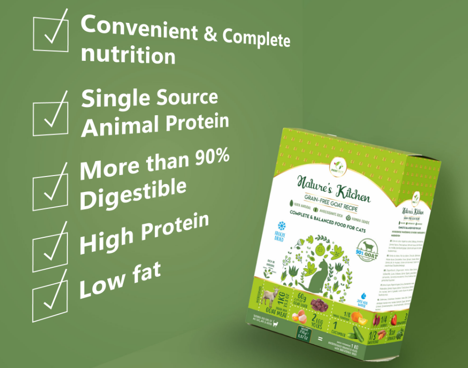 1 pak a 250gr Nature's Kitchen freeze dried Grain-free Goat recipe